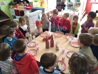 Céleste trakteerde met heerlijke cake en kinderchampagne en ze bracht ook een geschenkje mee voor de klas. Grote schoppen voor de zandbak en het liedjesboek herfst van Kapitein Winokio.