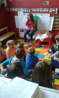 Gaëlle vertelde ons dat ze heel goed kan turnen. Ze vertelde ons wanneer ze gaat turnen, wat ze daar allemaal doet , welke kledij ze daarvoor nodig heeft en ze demonstreerde ons een koprol voorwaarts en koprol achterwaarts. Ze had ook leuke foto's mee van hun optreden. Dankjewel Gaëlle.