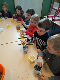 Wij maakten geen gewone vetbol maar een vogel-voedertas met oude tassen uit de kringloop, frietvet, een stok en een touwtje en natuurlijk zaadjes.
